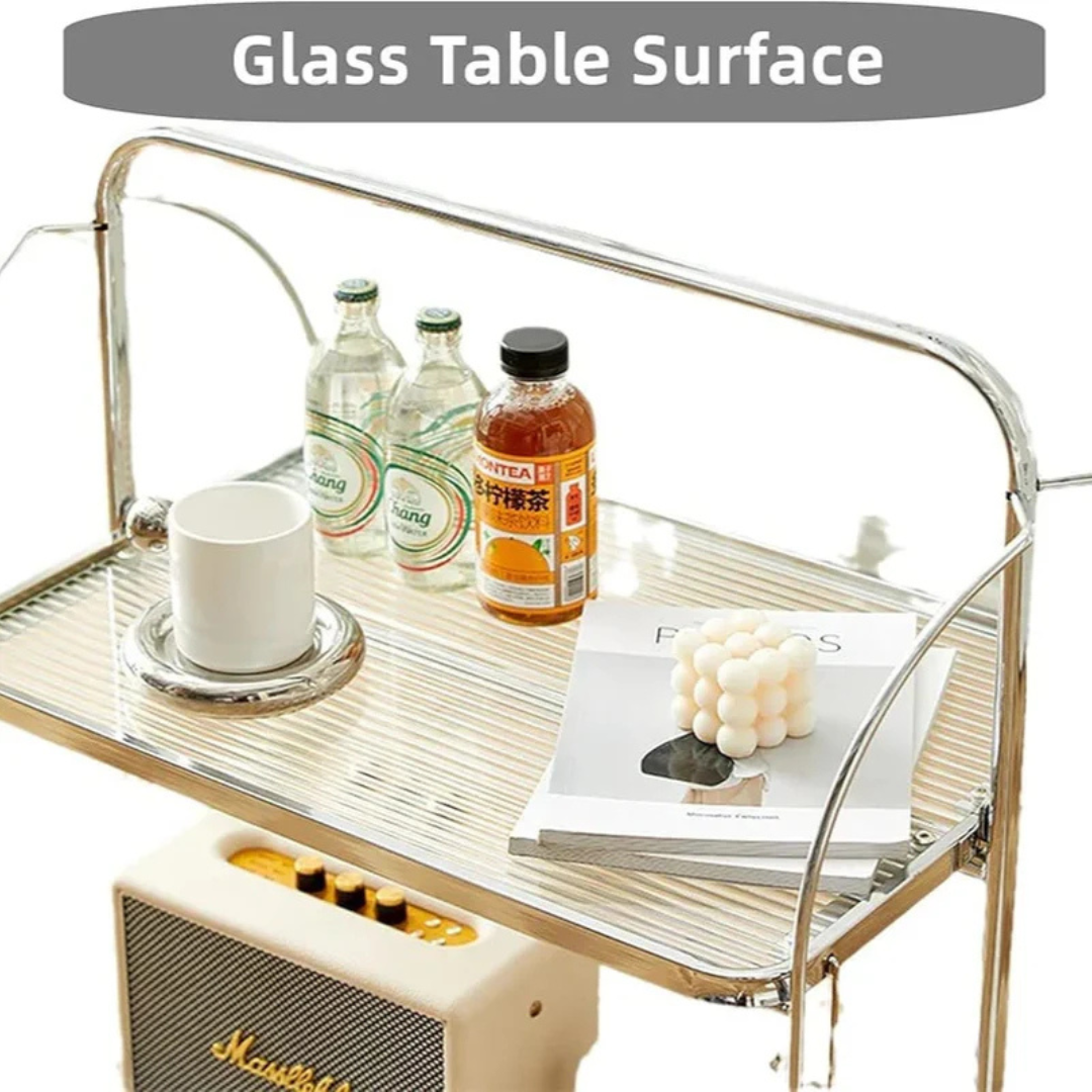 Enhance your serving and storage experience with this folding 2-tier serving trolley. Designed with mobility and convenience in mind, this rolling cart features a sturdy glass dining rack shelf.