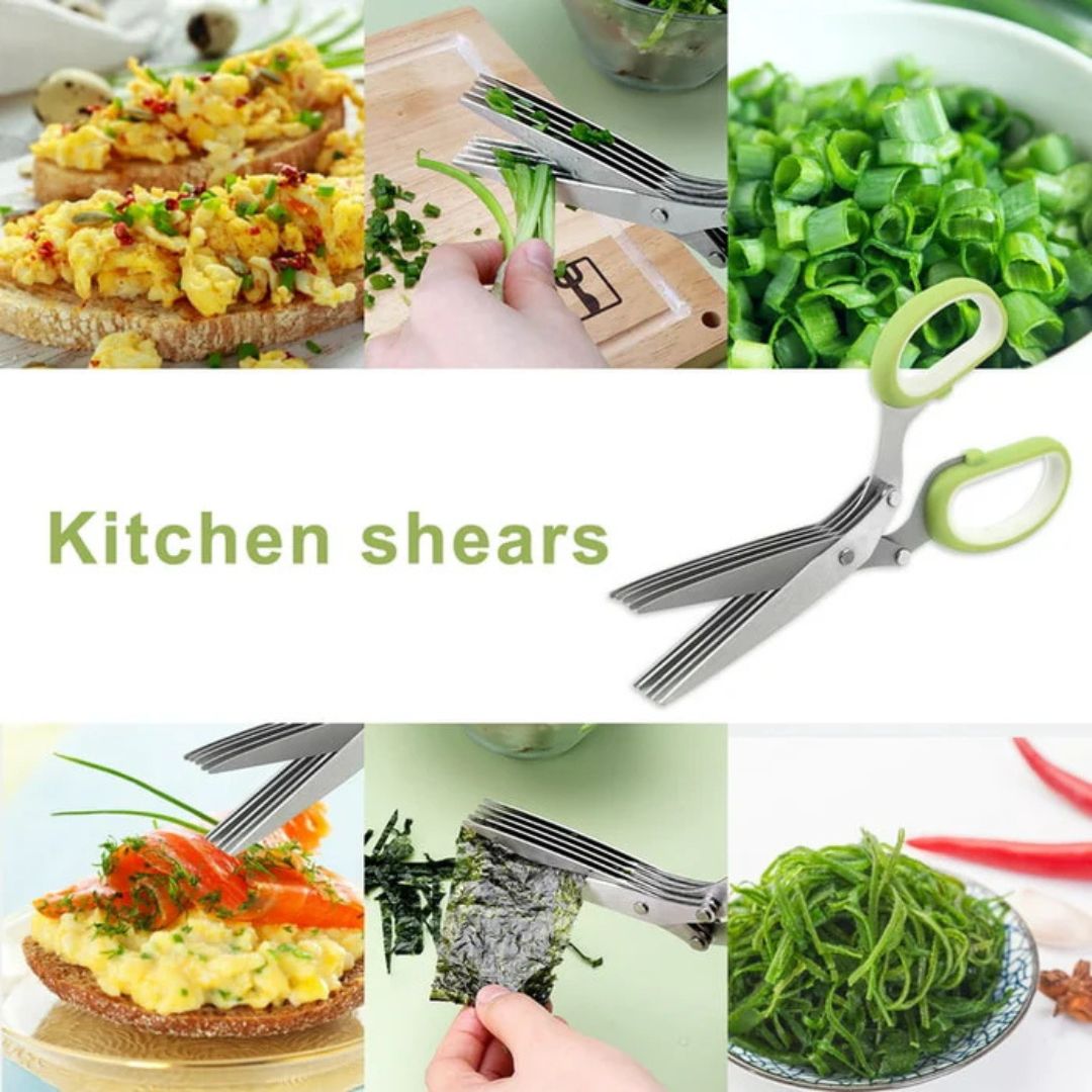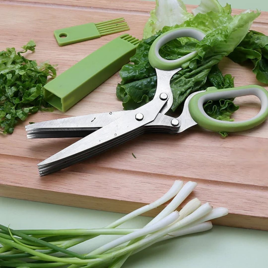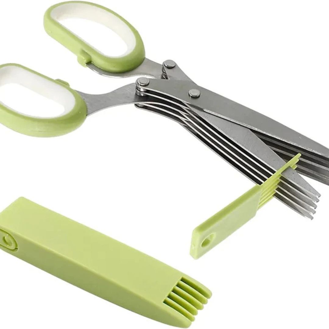 قطّع الأعشاب بسهولة مع مقص المطبخ الخماسي الشفرات المصنوع من الفولاذ المقاوم للصدأ. مزود بمشط تنظيف عملي لسهولة الصيانة. صُمم هذا المقص بدقة ومتانة، وهو أداة أساسية لأي طاهٍ منزلي.