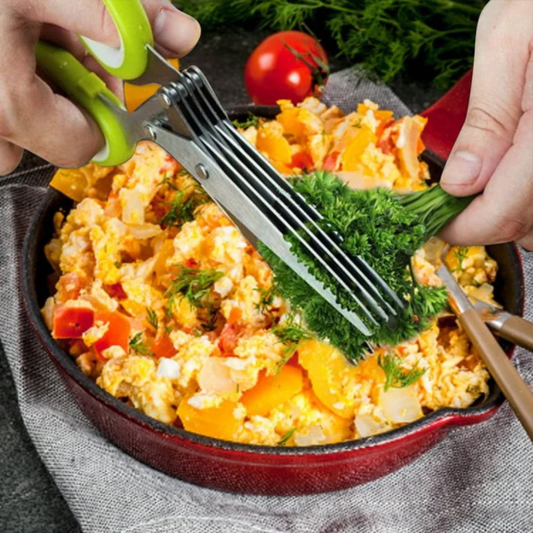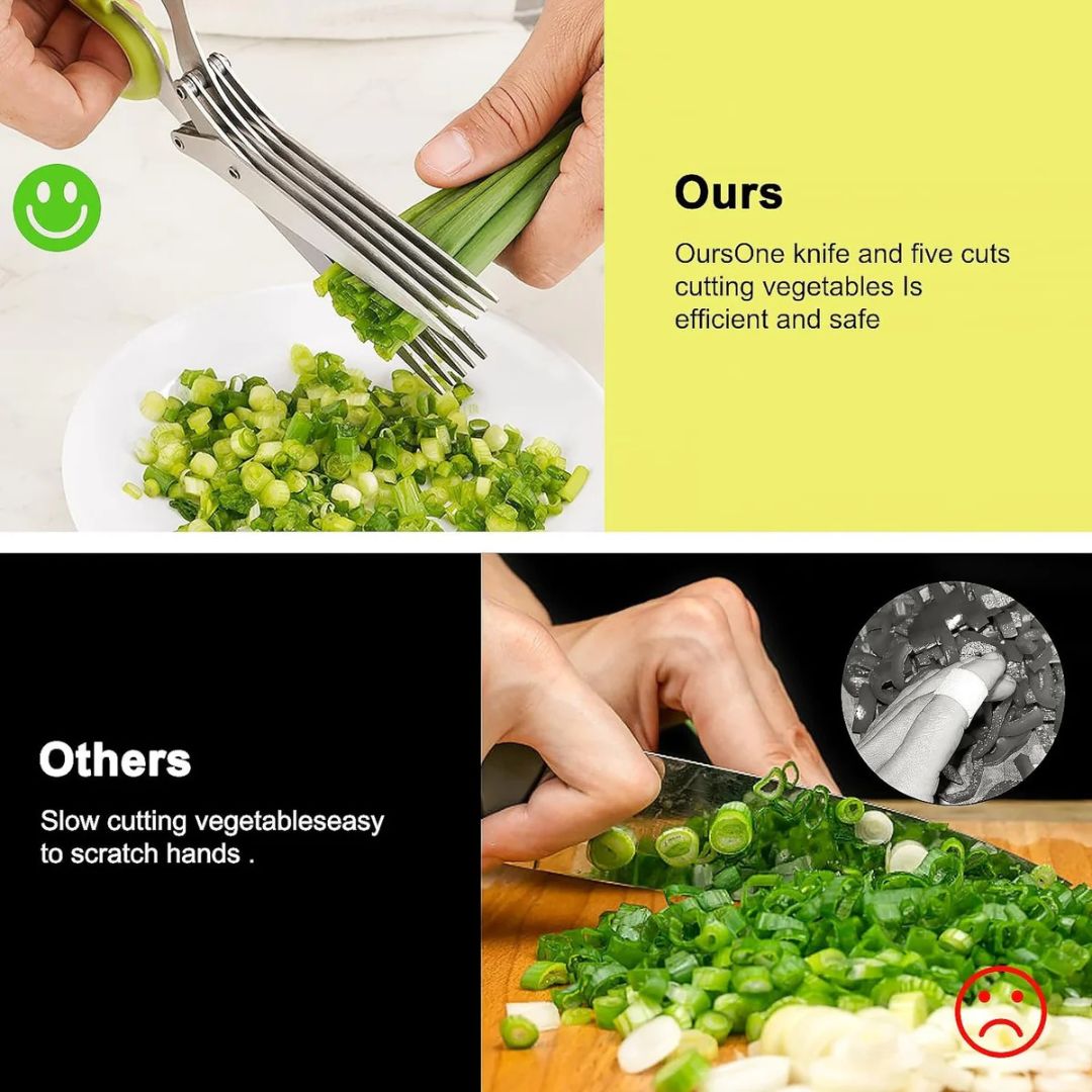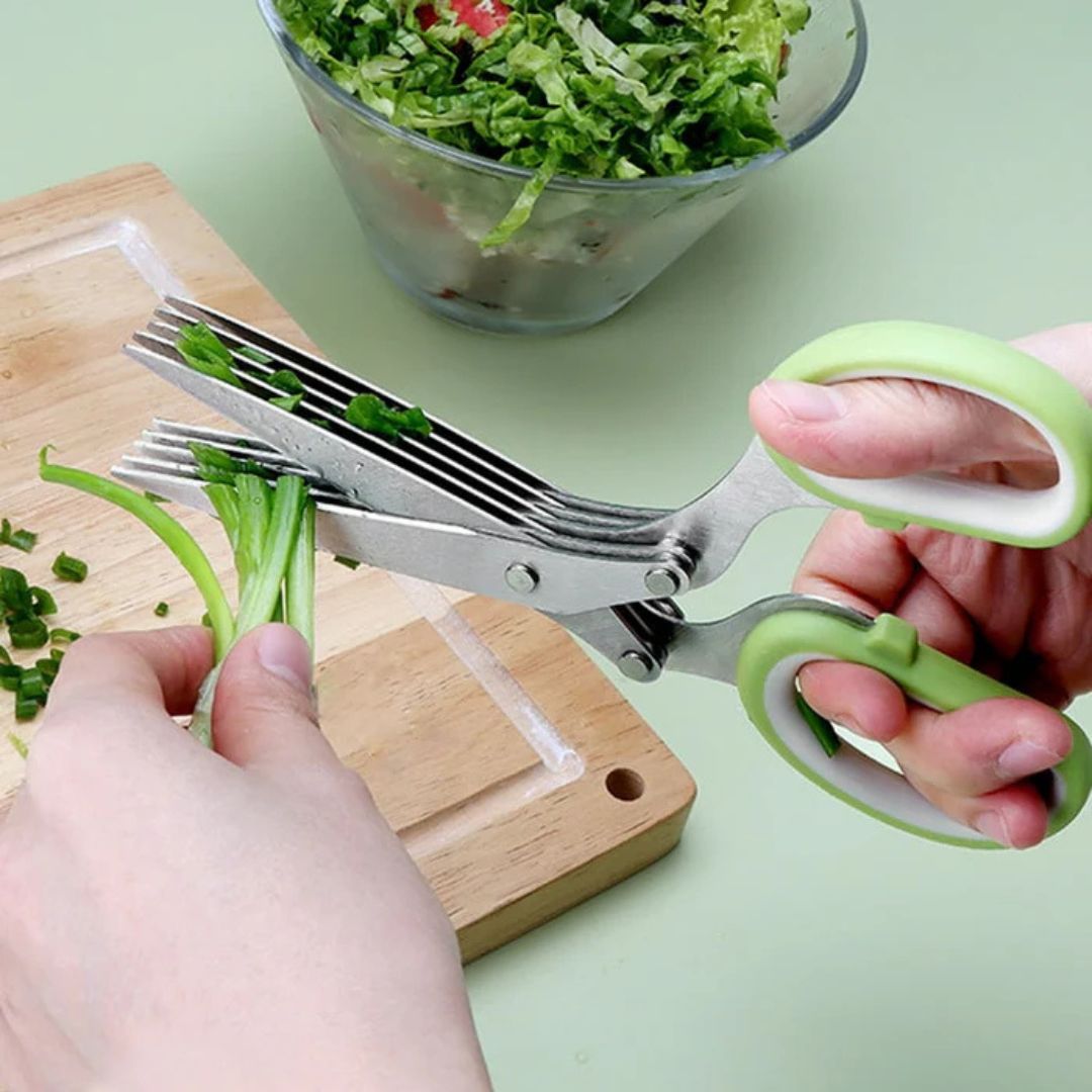 قطّع الأعشاب بسهولة مع مقص المطبخ الخماسي الشفرات المصنوع من الفولاذ المقاوم للصدأ. مزود بمشط تنظيف عملي لسهولة الصيانة. صُمم هذا المقص بدقة ومتانة، وهو أداة أساسية لأي طاهٍ منزلي.