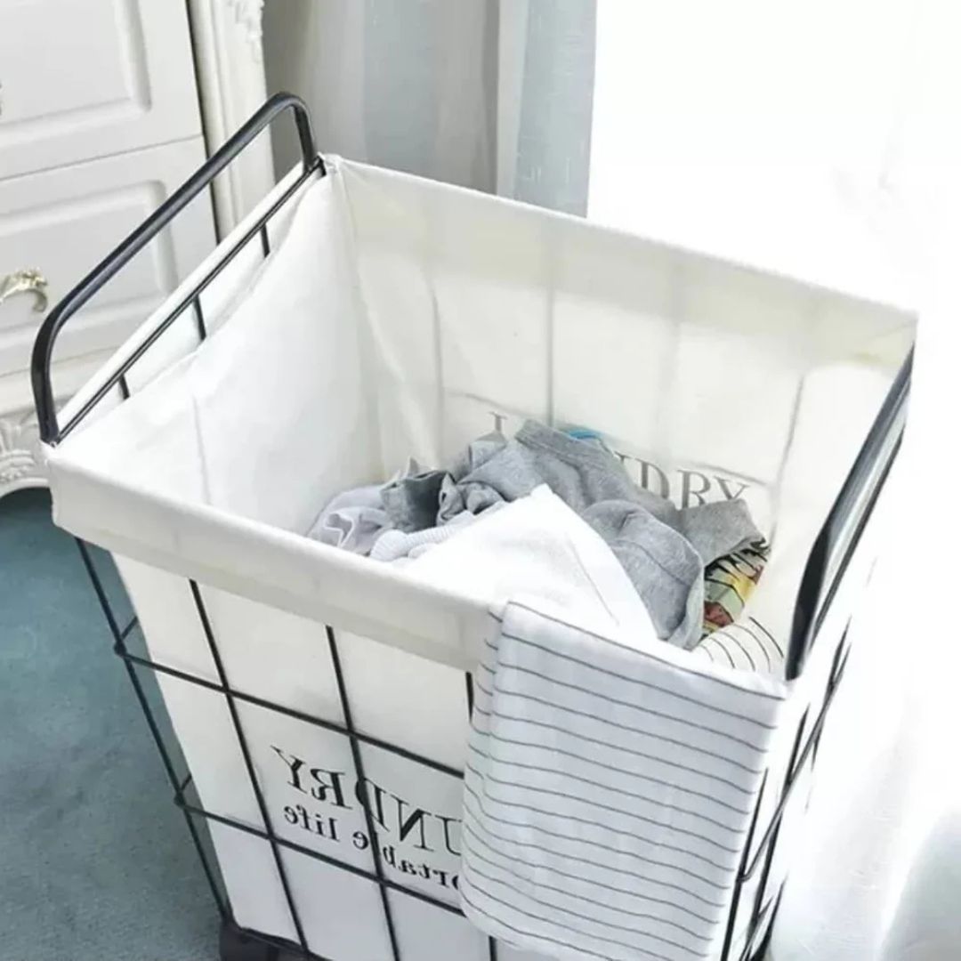 حسّني ملابسك مع سلة الغسيل المعدنية ذات العجلات. تتميز هذه السلة الكبيرة بإطار معدني متين وعجلات عملية لسهولة النقل.
