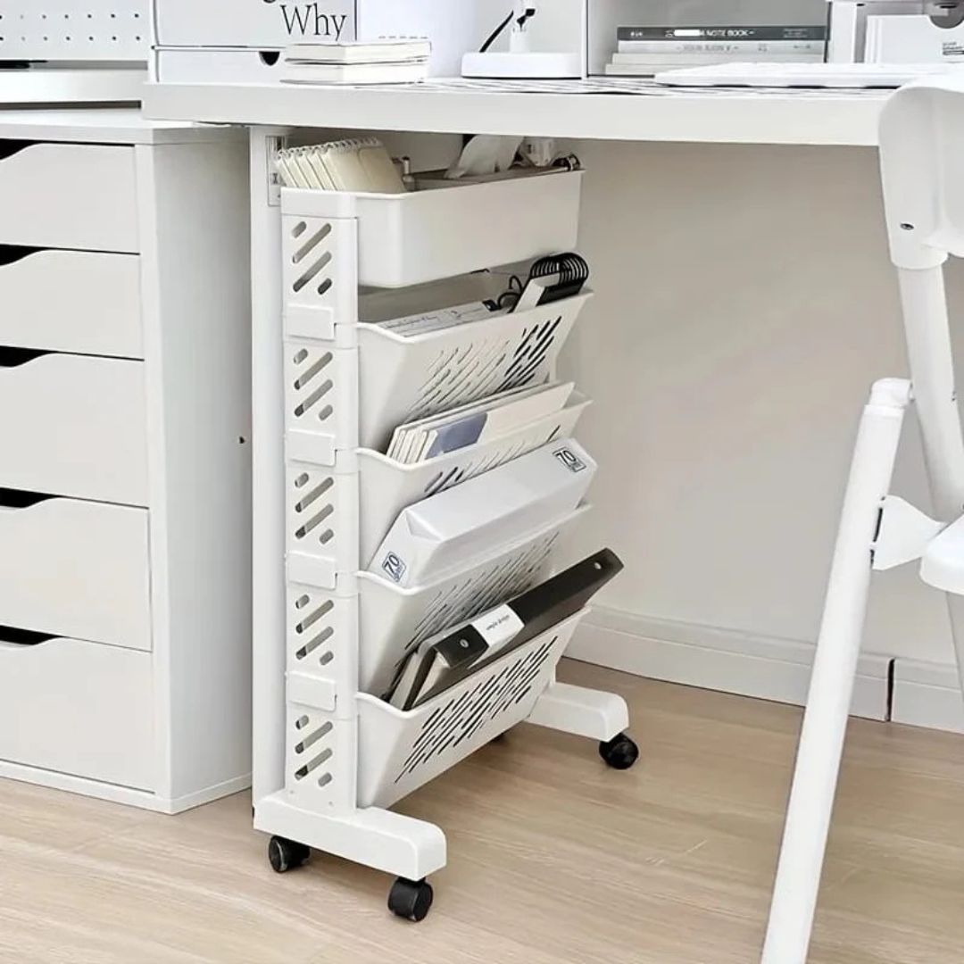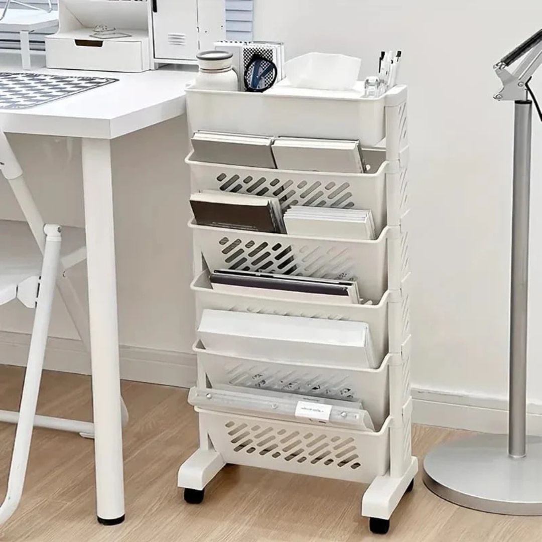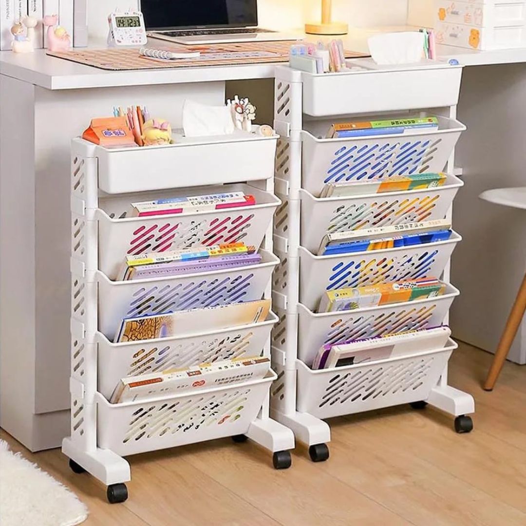 حافظ على تنظيم أغراضك مع هذا الرف المتحرك متعدد الاستخدامات للكتب ومنظم التخزين. تصميمه متعدد الطبقات وسهولة تحريكه تجعله مثاليًا لأي غرفة، حيث يوفر مساحة تخزين واسعة للكتب والديكورات والأغراض المنزلية.