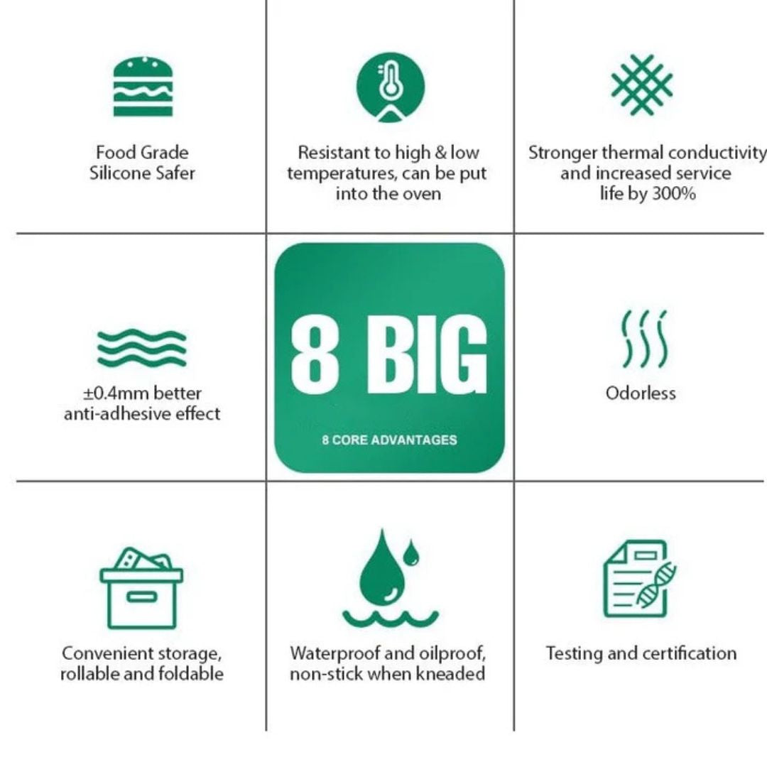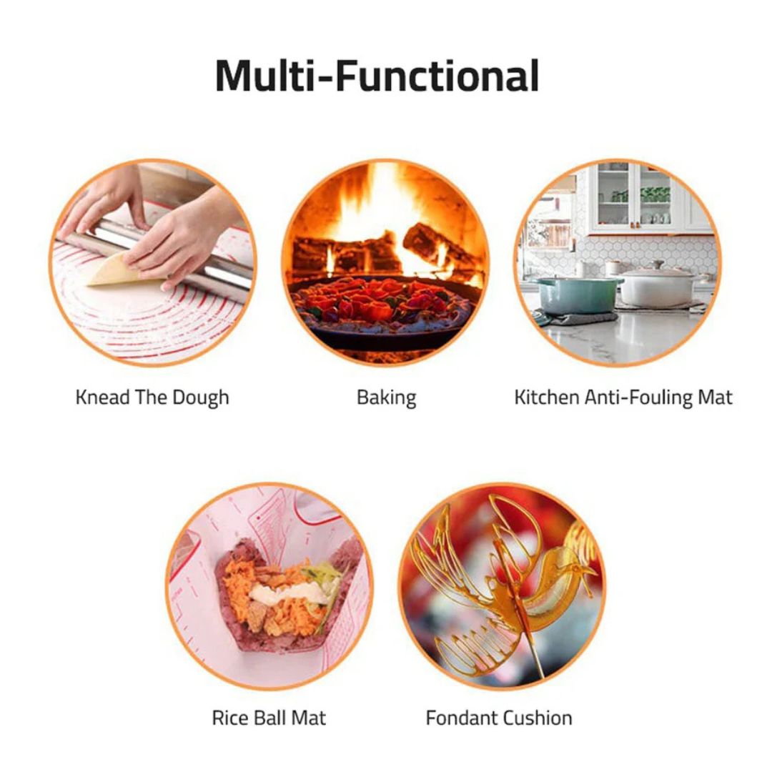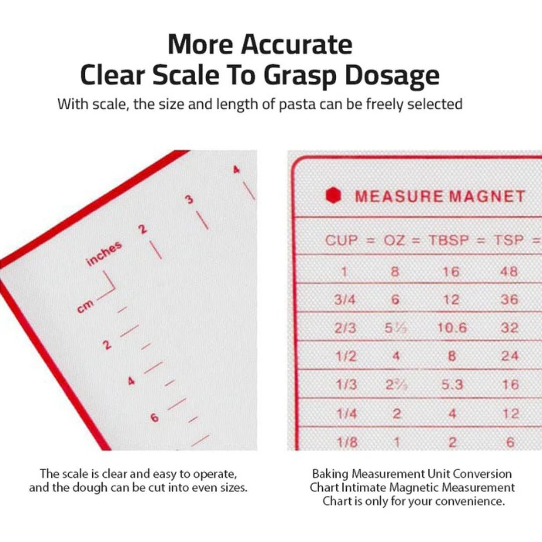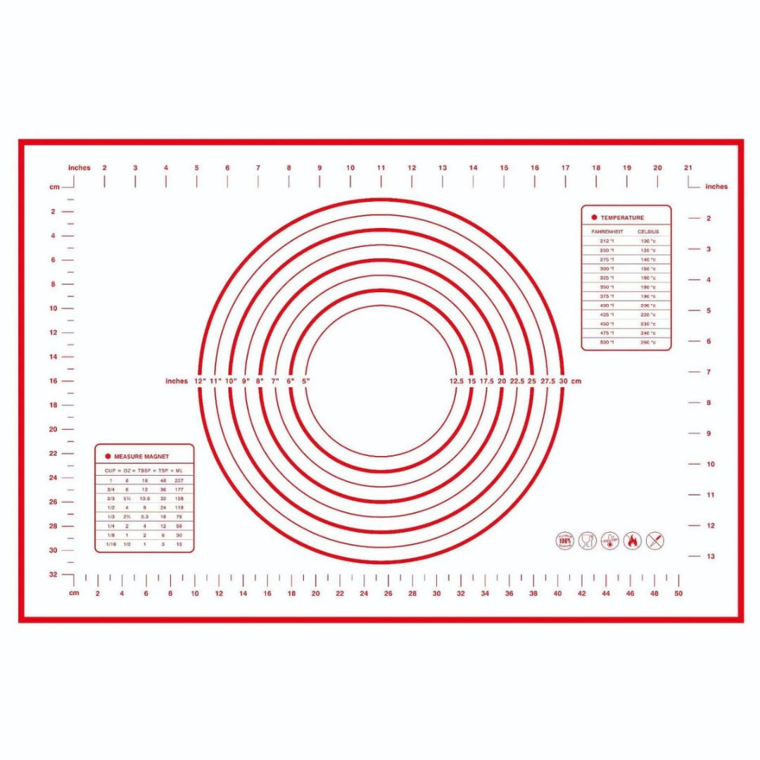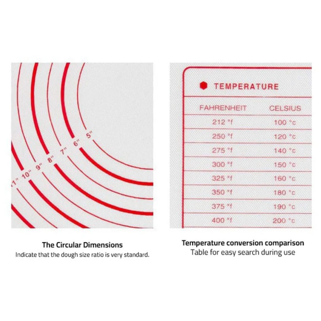 - دليل القياس: تأكد من التوحيد في المخبوزات الخاصة بك باستخدام القياسات المفيدة المحددة على السجادة، مما يسمح بتحديد حجم المعجنات والبيتزا والمزيد بدقة.